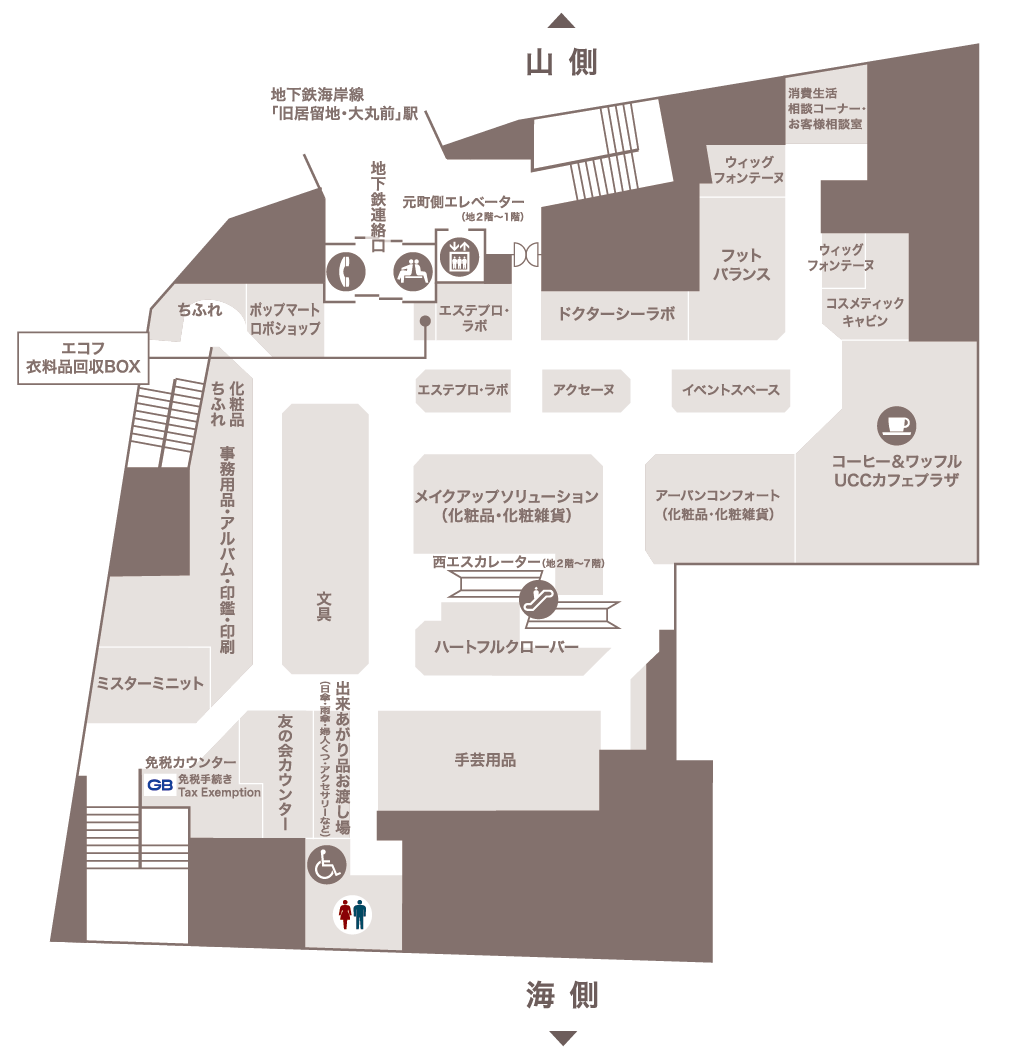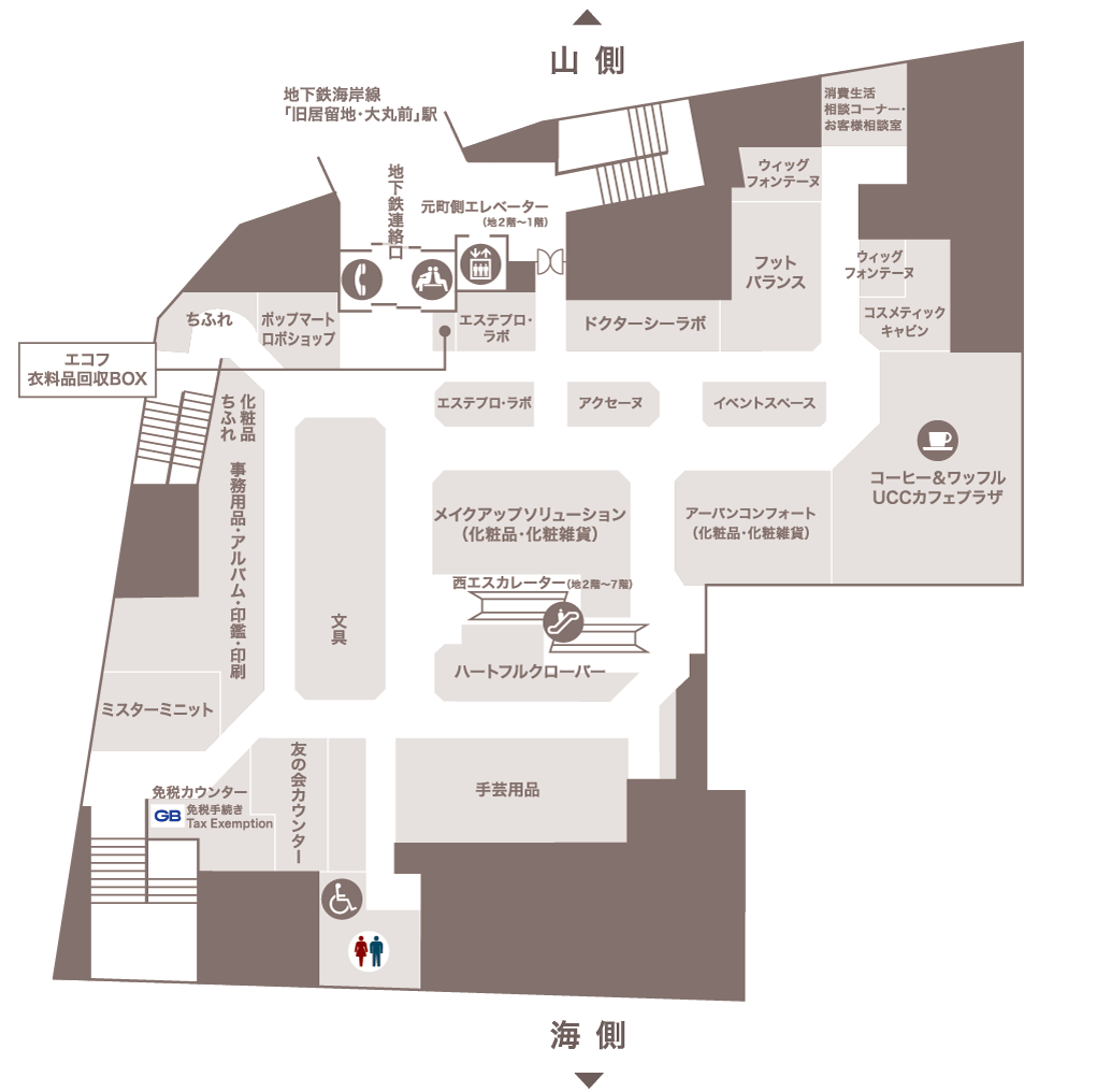 1階元町玄関外のエレベーターをご利用ください。