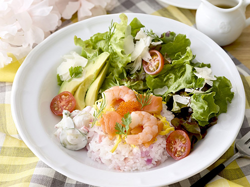 サーモン、海老、とびっこなどを甘酢しょうがとレッドオニオンのマリネを合わせたごはんにのせ、アボカド、小柱とラディッシュのサワークリームマリネをトッピング。わさび醤油ドレッシングがアクセント。【展開期間】4月22日(水)まで