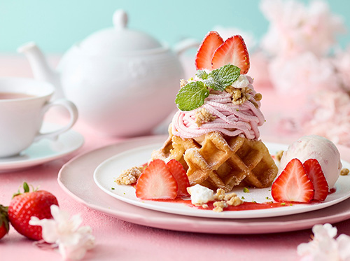 ワッフルにレモンチーズホイップを重ね、さくらホイップと苺をトッピング。ほんのりさくらが香るストロベリーソース、さくらアイス、ホワイトチョコとメレンゲのグラノーラとともに。【展開期間】4月22日(水)まで