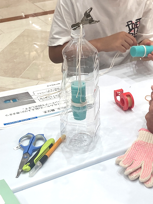 参加者は、地震計の仕組みや揺れの周期について学んだ後、ペットボトルや粘土など身近な材料を使用して地震計と地震台を制作し、揺れの記録・観察を行いました。ペットボトルの側面を切る工程に少し苦戦する様子も見られましたが、学生たちのサポートによりすべての組が地震計を完成させることができました。