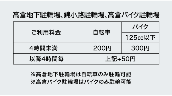 *2:2時間以上駐輪場をご利用のお客様は有料となります。無料サービス時間を超えてご利用された場合は、駐輪開始から出庫までの通常利用料金が発生いたします。
