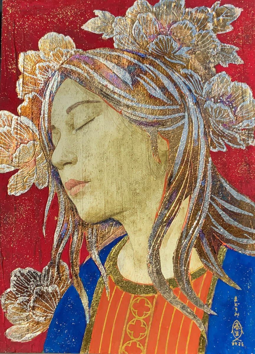 神秘的な女性像や花や果実を日本画の画材で描いています。箔焼きとは銀箔を変色させる日本画の技法です。黒変すると思われがちですが、赤や青、紫など様々に変化し、その色は人を魅了します。この変幻自在な光と色彩を楽しんでいただけたらと思います。