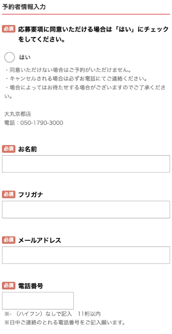 | 予約選択可能時間 | 12時・13時・14時・15時・16時・17時 ※都合によりお受けできない時があります |