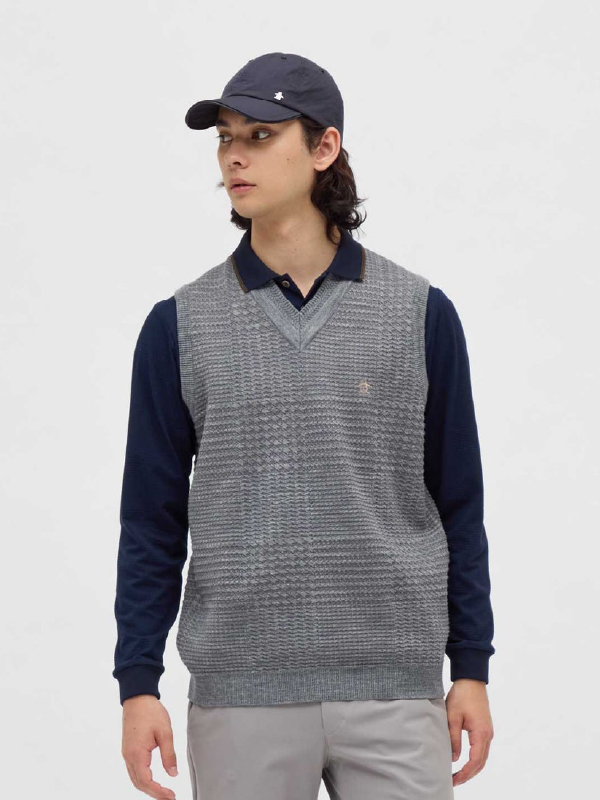 - キルト風ジャカードタフタのリバーシブルベストです。ネイビー、ブラウンの2通りの着こなしが楽しめる、〈マックレガーゴルフ〉おすすめのアイテムです。