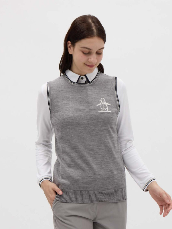 - 左胸のペンギンロゴをインターシャで表現した、クルーネックベストです。日本製で丁寧に縫製しています。ポロシャツだけでなく、モックネックシャツとの相性も抜群で、様々なコーディネートを楽しめます。