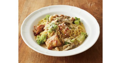 ポルチーニや、たまり醤油などを使用したコクのあるクリームソースに、ローストチキンと舞茸、しめじ、ロマネスコを合わせました。