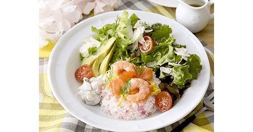 サーモン・海老・とびっこなどを甘酢しょうがとレッドオニオンのマリネを合わせたごはんにのせ、アボカド・小柱とラディッシュのサワークリームマリネをトッピング。わさび醤油ドレッシングがアクセント。