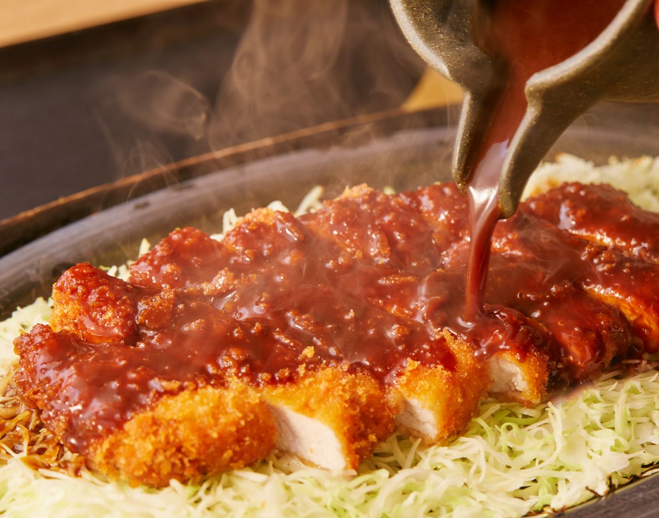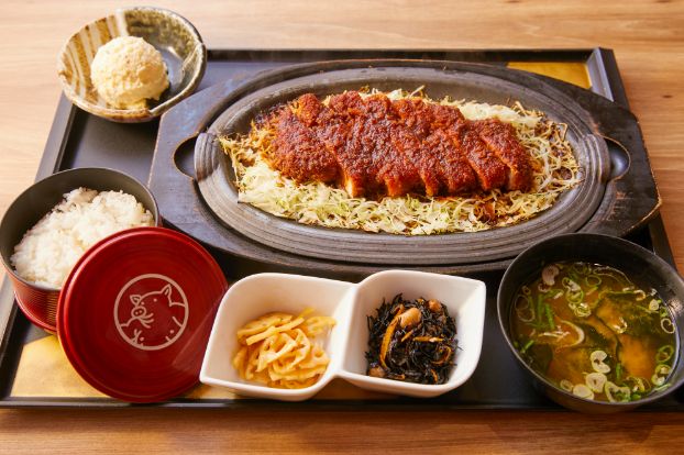 熱々の鉄板にキャベツを敷き、揚げたての黒豚ロースとんかつを乗せ、目の前でみそだれをたっぷりと。ジュージューという音とともに立ち上る香ばしい湯気に食欲がそそられる看板メニューです。鹿児島産の黒豚は、お肉の甘みとうまみが濃い特選品。合わせるみそだれは、職人の手による秘伝のレシピ。さらっと甘めで、とんかつと喧嘩せず、さりとて負けず、互いを引き立て合う絶妙なコク旨バランスがミソなんです。