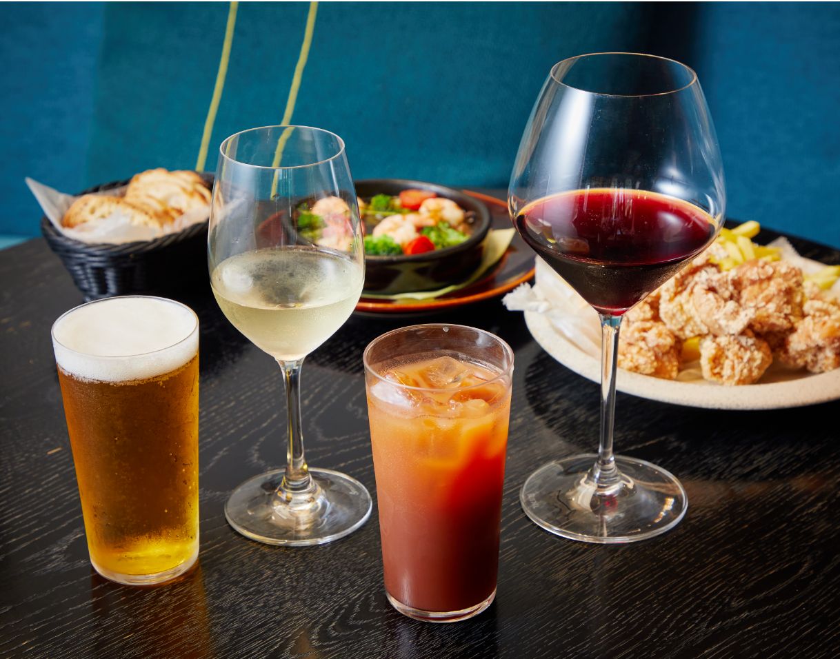 窓からテラスを臨む開放感のある店内に、ゆったりくつろげるソファ席も豊富で、女子会にぴったりなロケーション。ピンチョス、生ハムなどの前菜、チキンフリット、アヒージョとお酒が進むラインアップに、チキンソテーとパスタもセットになった充実のコースメニュー。ビール、ワイン、カクテルなど多彩なドリンク類も飲み放題で、昼から飲める幸せを満喫。ホリデーシーズンらしい華やかなひと時を。