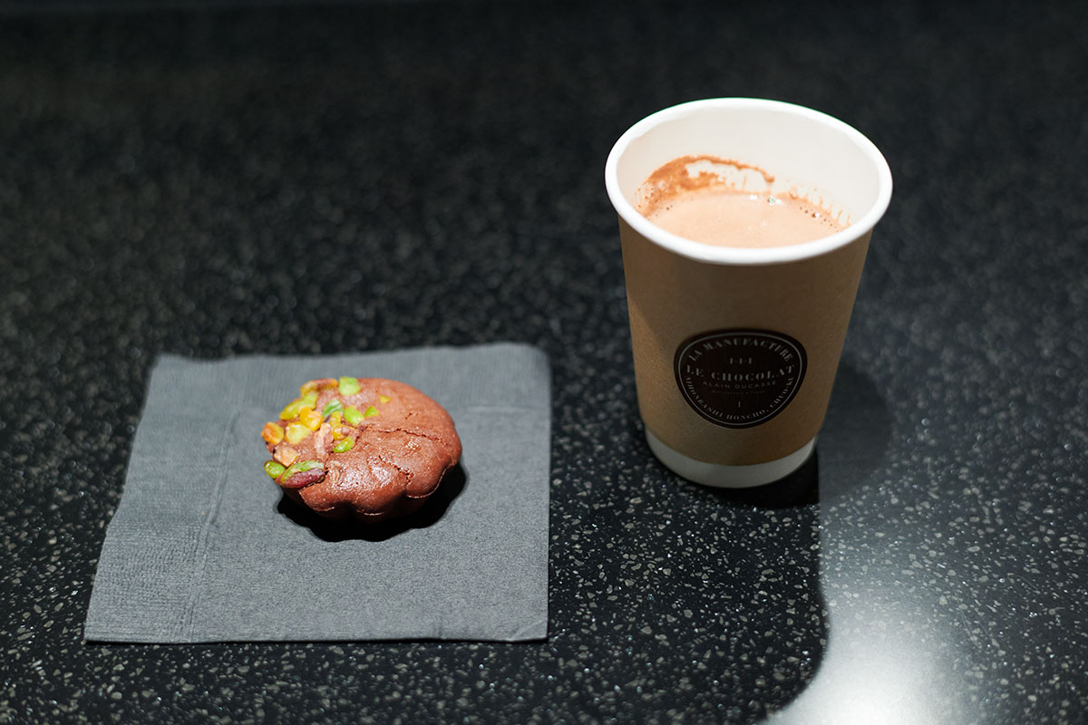 「モワルー・ピスターシュは、ちゃんとチョコレートの濃厚さがありつつ、やわらかな生地の中でピスタチオの食感が効いて爽やかですね。ショコラショーはめっちゃおいしい。濃厚な味ですがくどすぎない。買い物をして疲れたときにちょっと甘いものを入れるのにちょうどいいですね」