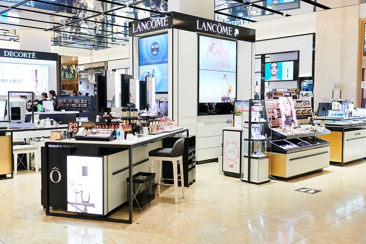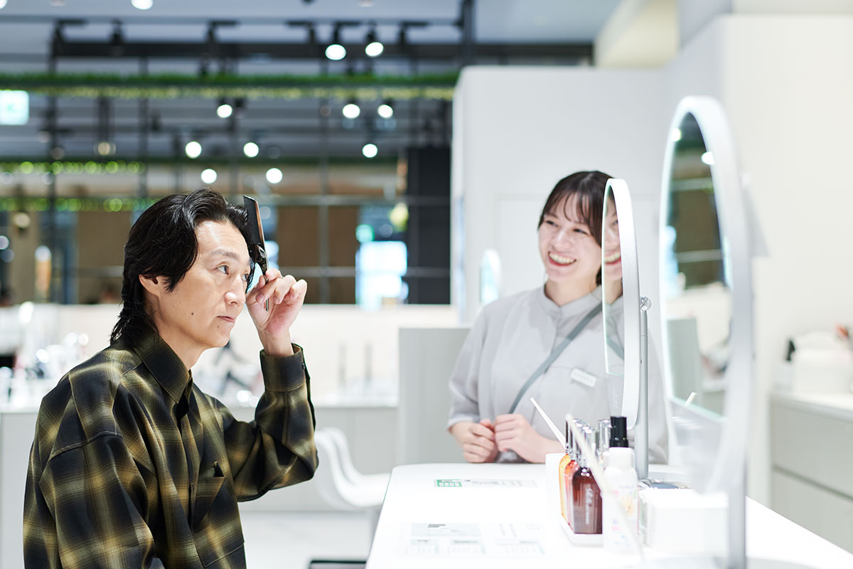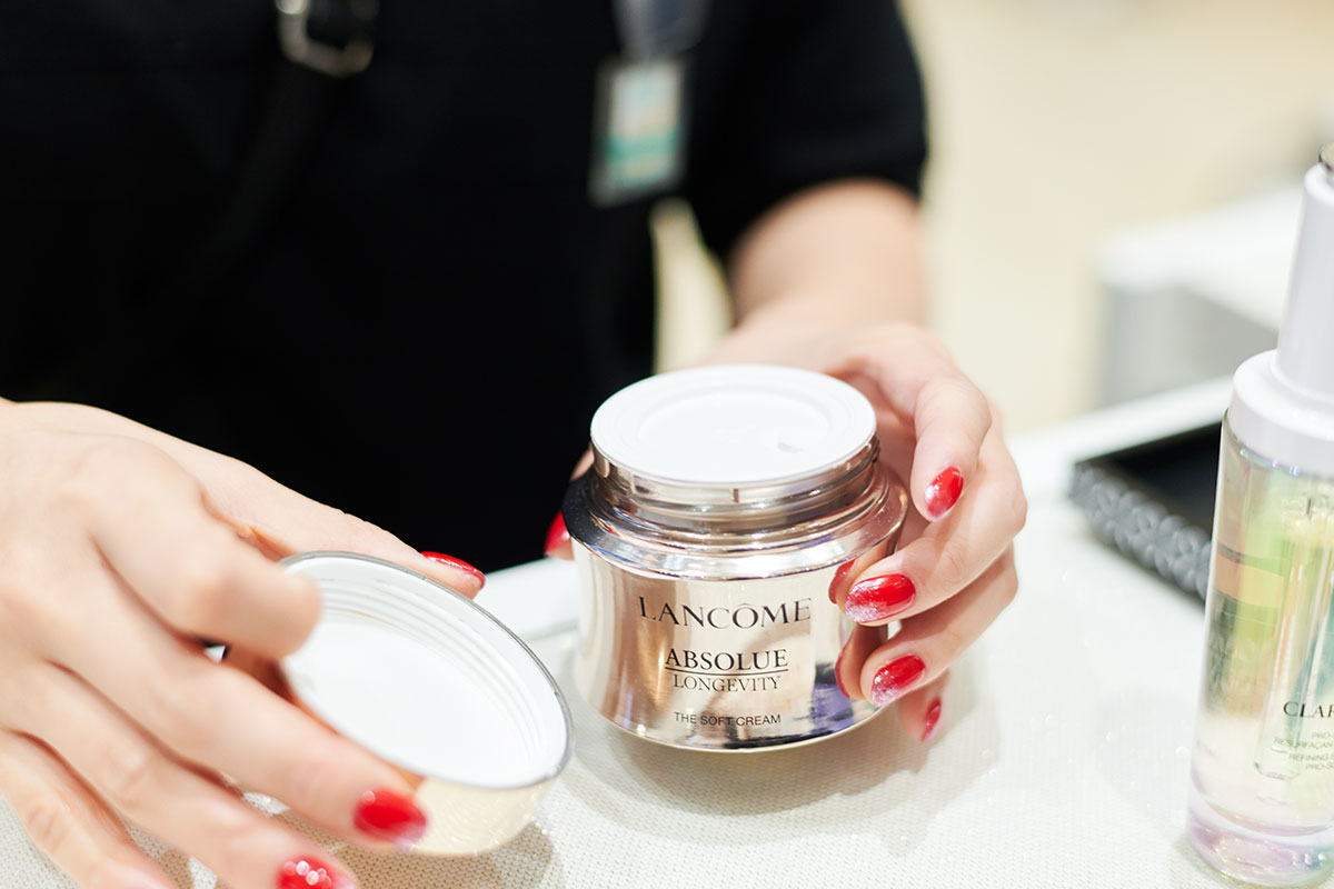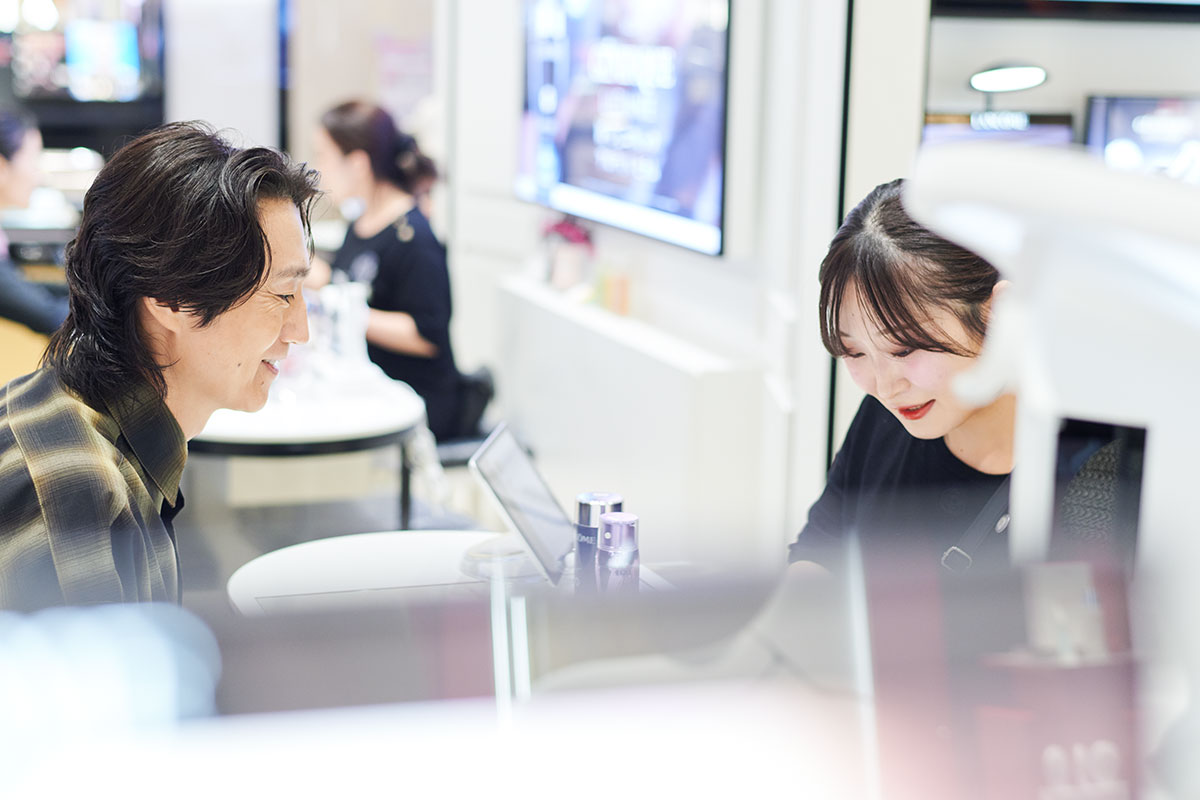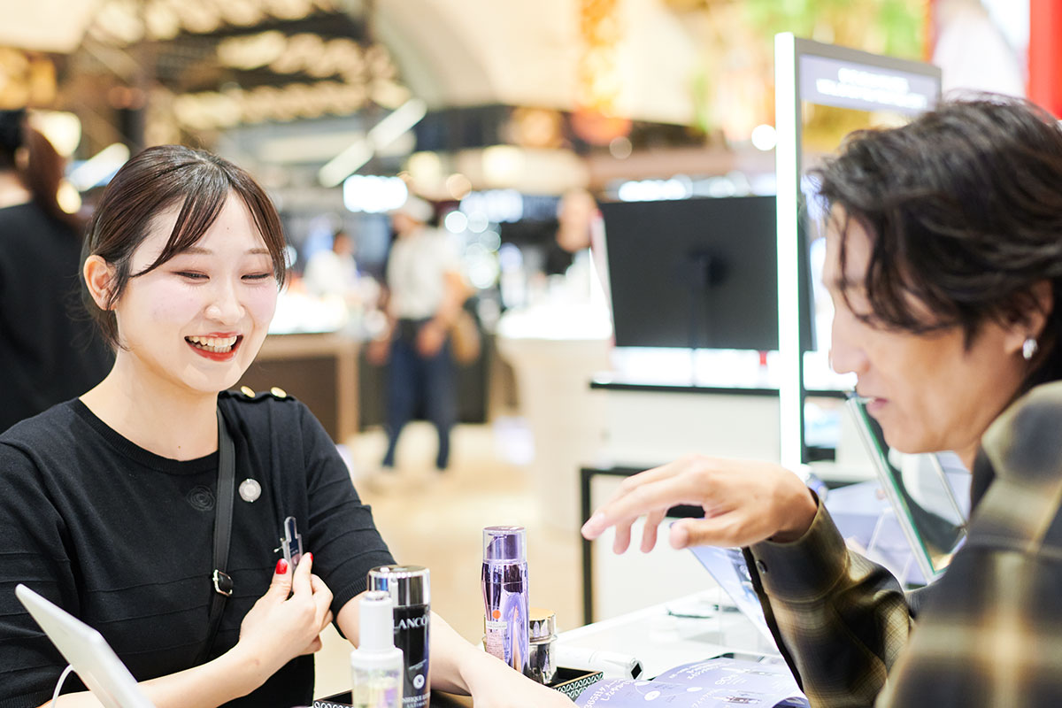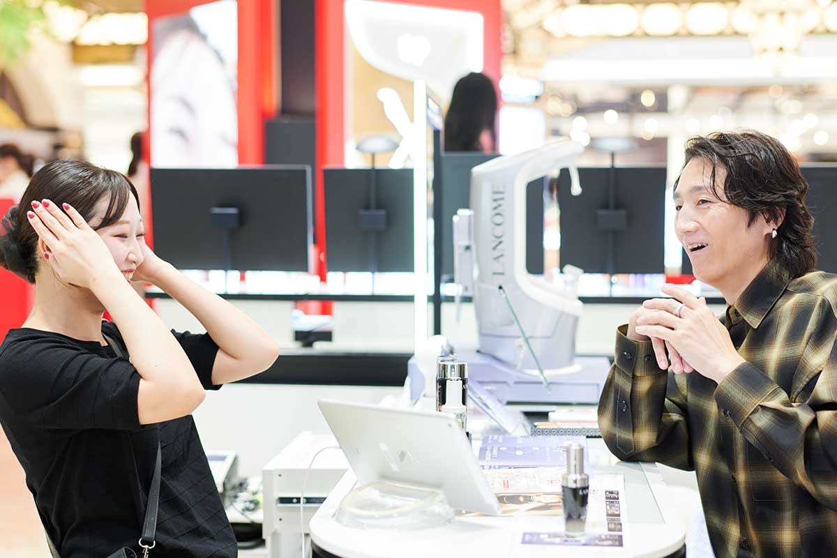 多くの人でにぎわう大丸心斎橋店本館1階の化粧品フロアで、「ランコム」のカウンターに座った落合さん。スタッフの「今はどのような商品をご愛用いただいていますか?」という質問に、「今愛用しているのは、ジェニフィックの美容液、クラリフィックの化粧水、そしてレネルジー トリプルセラムと、結構いろいろ使っています」と答えます。