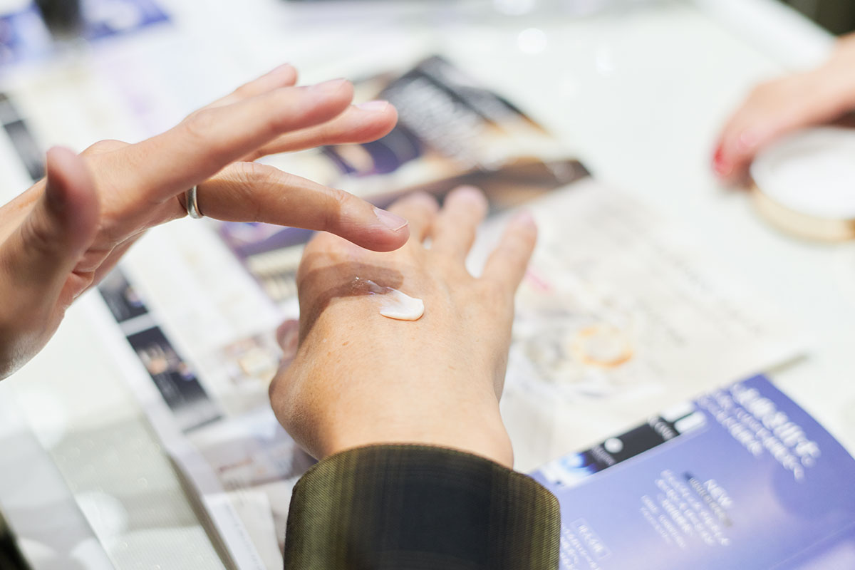 タッチアップで手にクリームを塗った落合さんの感想は、「サラッとしてますね」。