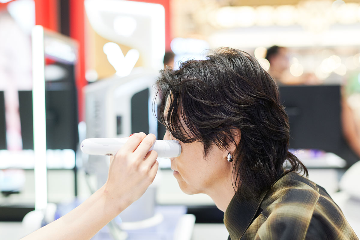 「夏フェスに行くことが多いからかなあ・・・日焼け止めも『ランコム』を使っていますよ」と言う落合さんに、スタッフは「季節によってお肌を取り巻く環境も異なりますし、そのときのストレスによっても肌の状態が変わってくるので、季節ごとに肌測定をして、それに合ったスキンケアアイテムを使っていただくのがおすすめです」