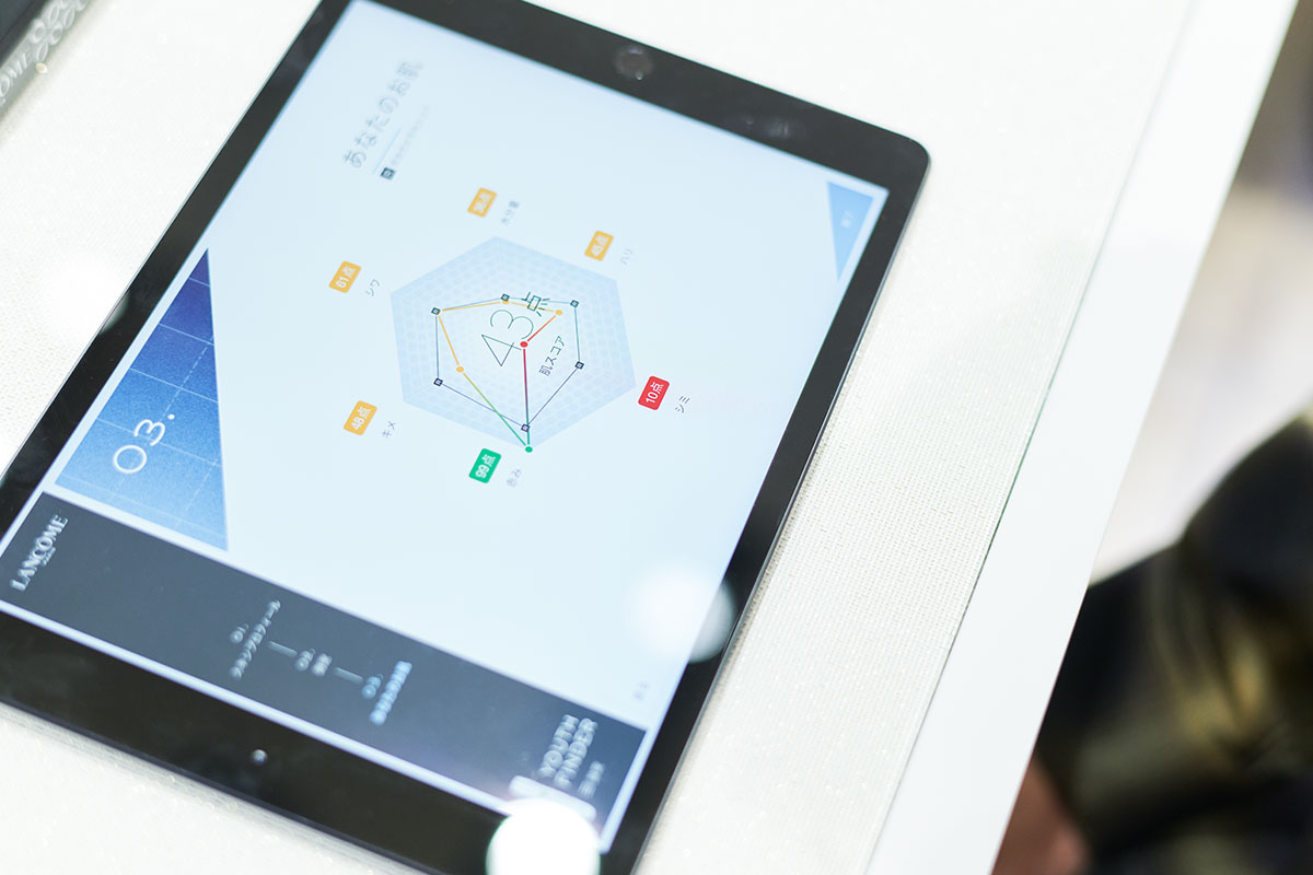 大丸心斎橋店「ランコム」のカウンターでは、機械による肌測定もしてくれます。測定器によって顔のお肌測定をした落合さんに、「すごい! 完璧ですね。全体的にすごくきれいな肌。しっかりお手入れしていただいていると思います。ただシミの測定に関してはお手入れの必要性があると出ています」とスタッフ。