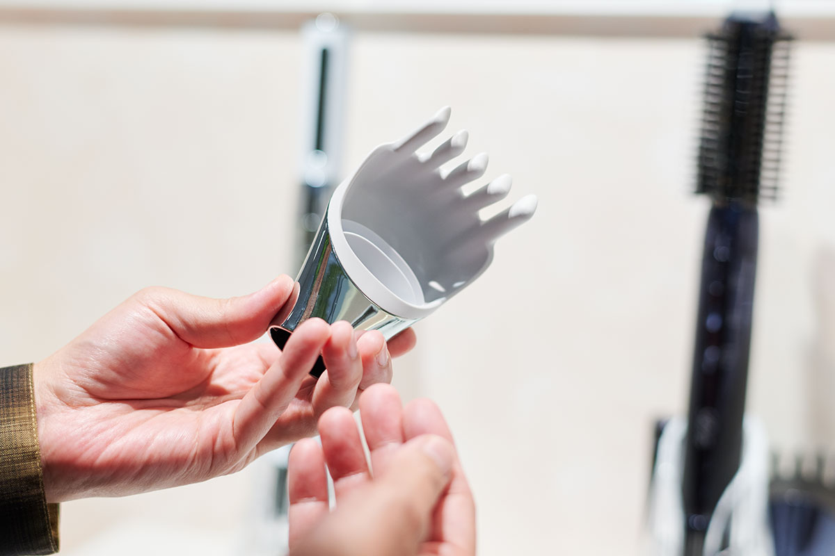 「こちらはスカルプアタッチメントになります。落合さんの髪の毛も、ヘアメイクさんがしたのかなと思うぐらいきれいにウエーブがかかっていますが、これを使うと根元が立ち上がりやすくなり、自然なボリュームが出ます」と園部さん。