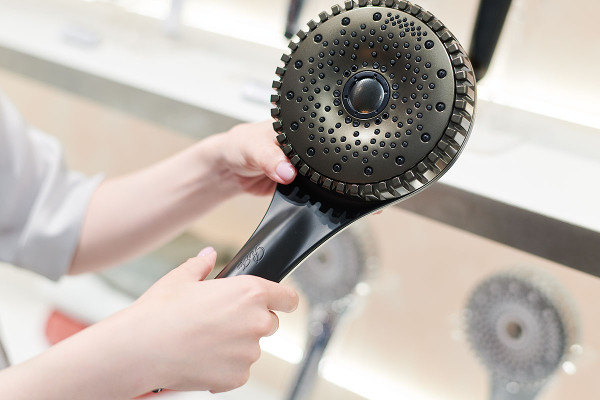 続いてシャワーヘッドのコーナーへと案内された落合さんは、「シャワーヘッドだけでこれだけの種類があるのはすごいですよね。やっぱりミストがすごいんですか?」と質問。