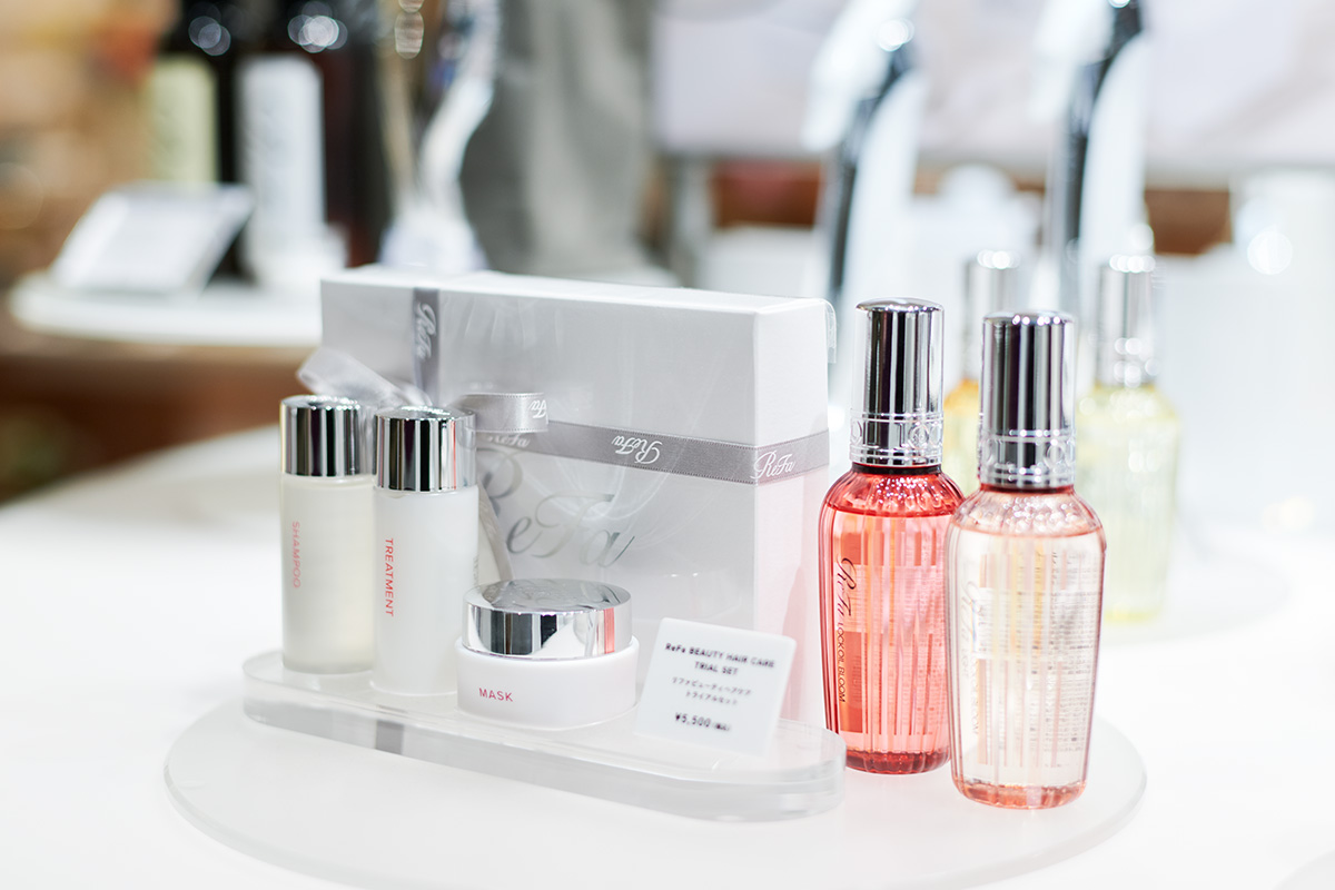 「ドライヤーやアイロンの熱によるダメージを補修してくれるヘアマスクです。シャンプーとトリートメントの間に髪の毛にこれを塗り込むことで、トリートメントの浸透を高めます。週に2、3回のスペシャルケアですね。こちらにシャンプーやトリートメントなどが入ったトライアルセットも用意しています」と園部さん。