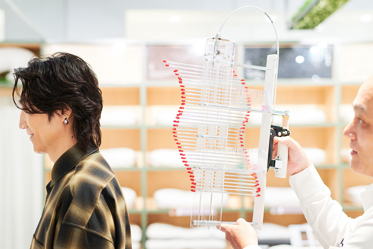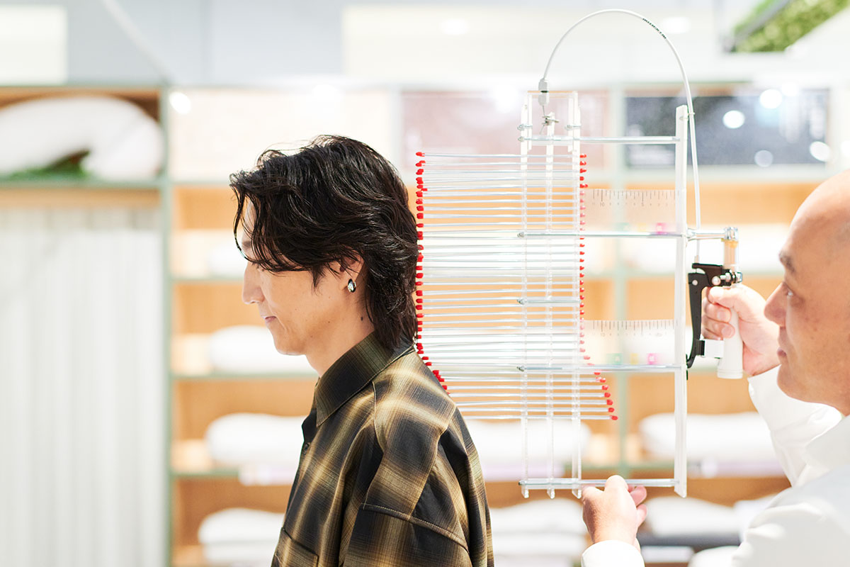 落合さんの後頭部のラインを測定した宇佐美店長は、「私どもはまくらを、高め、ミドル、低めの3段階用意しているのですが、落合さんの場合は高めないしはミドルがいいかと思います」