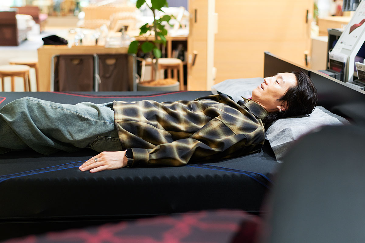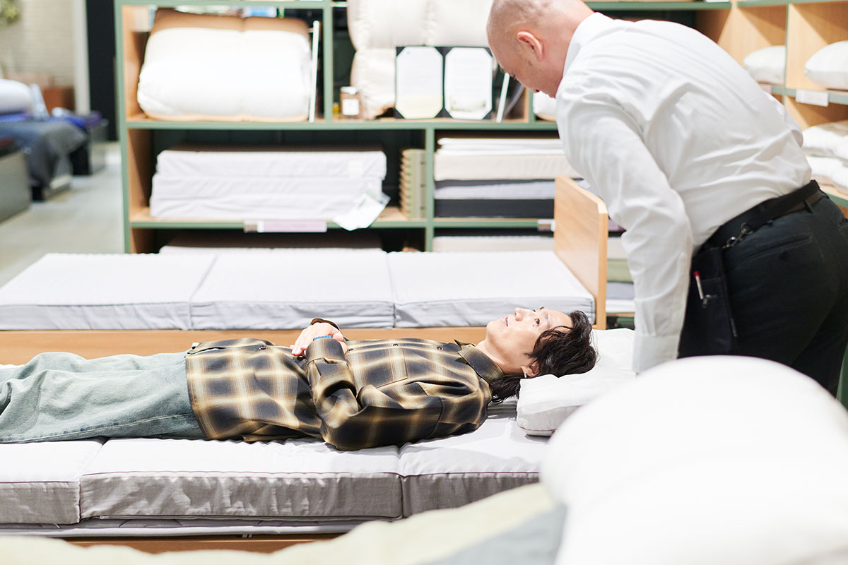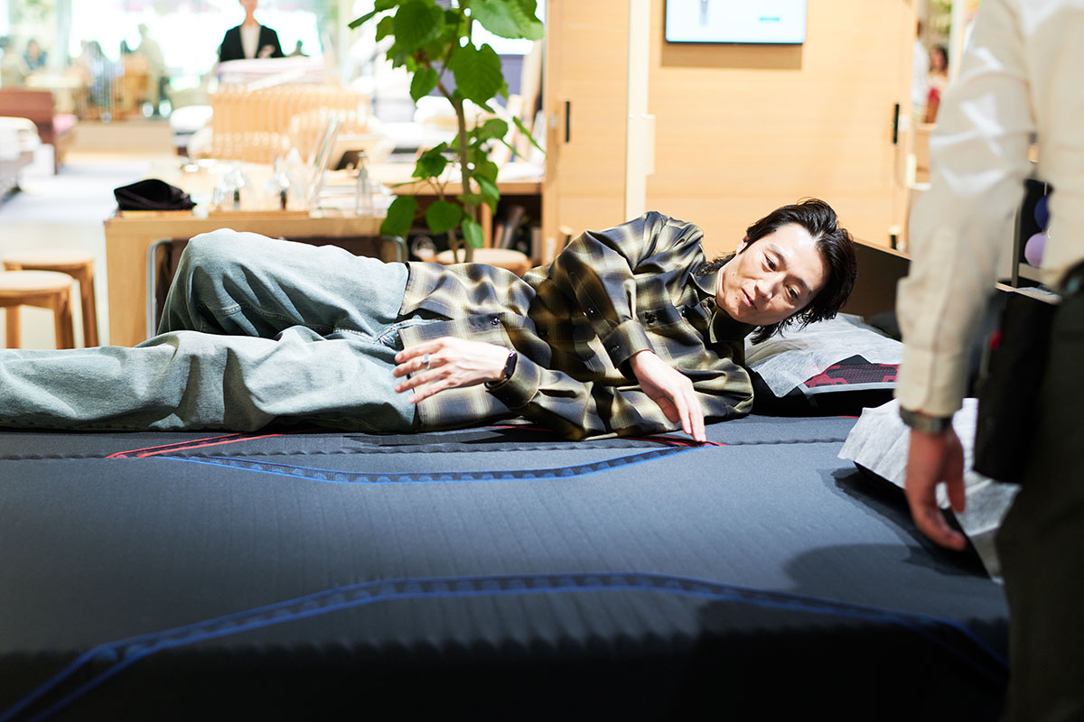 マットレスに寝転びながら、「重力に身をまかせてしまいますね」と言う落合さんに、宇佐美店長は、「おっしゃる通りで、睡眠というのは普段多くの影響を受けている重力からの解放がテーマのひとつと考えます。まっすぐ立った姿勢がそのまま横になって、マットレスに合っていれば、快適に寝れるはずです」