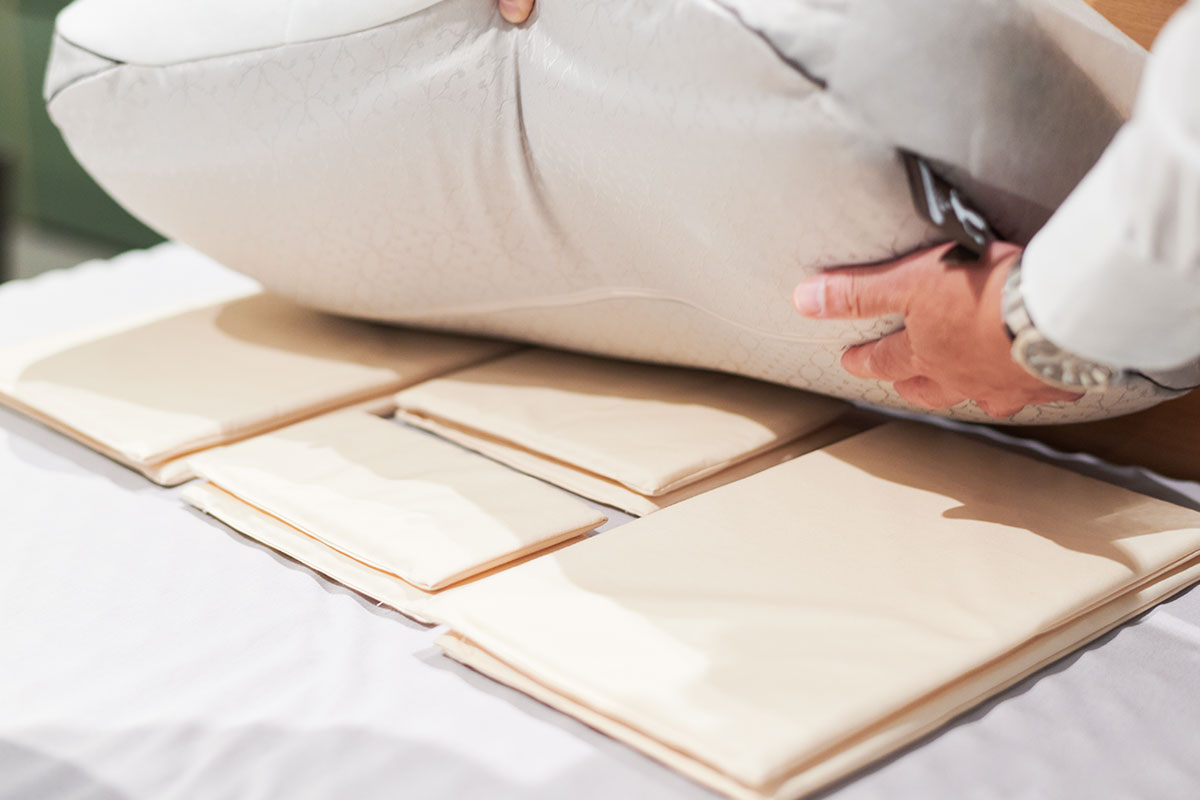「頭を乗せてジワーッと沈んだところがみんな同じ高さになればいい。仰向けと横向きだと高さが違うんですね。だから私ども西川では3つの列を追加で細かく調整して、その方にあったオンリーワンのまくらをおつくりいたします」と宇佐美店長。