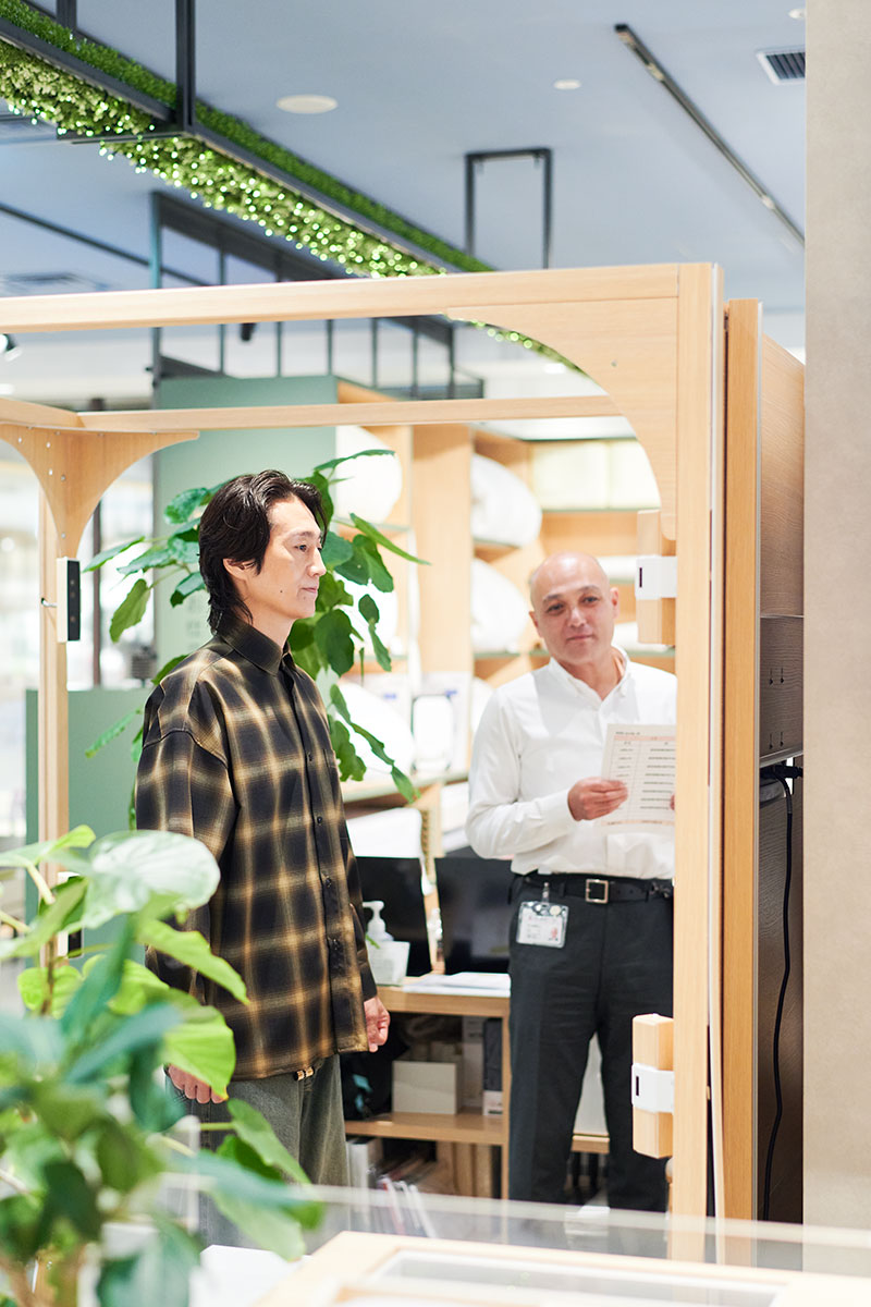 「12台のカメラでお客様の体を測定して、身体や骨格などの歪みを測定できます。それに基づいてどのマットレスがいいのかを推測するための機械です」と宇佐美店長。