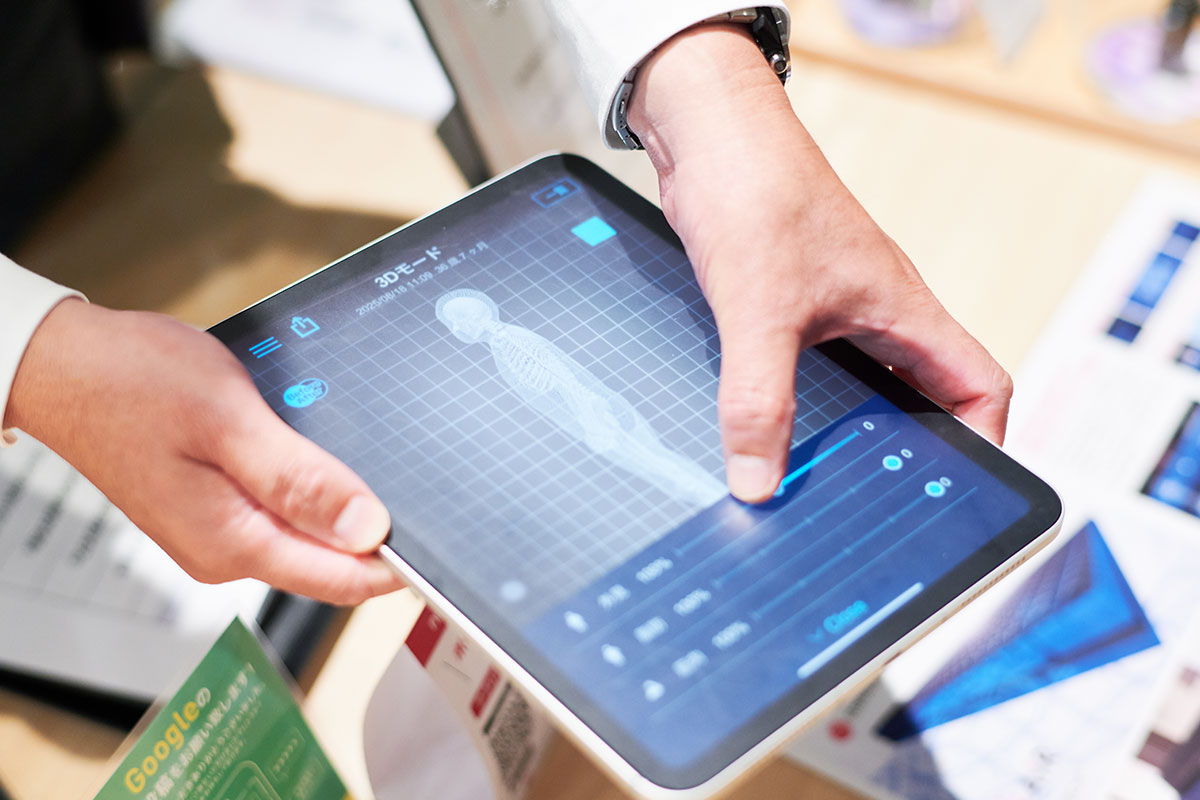 まくらに続いて、マットレスも体感しようと、約120万点の測定点で全身の形状を計測できるスリープレコメンド測定機「N3D-body」で落合さんの体を測ってみることに。この機械は、西日本にある「日本橋西川」では、大丸心斎橋店だけに設置されています。