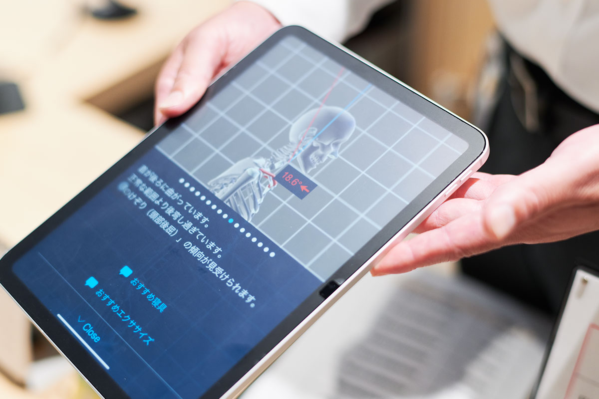「ちょうどいいのは、真上を見てる状態から軽くあごが引けている状態ぐらいに目線がくること。まくらの高さを高めかミドルか低めをまず決め、そこから高さ1cmの高さ調節シートを足したり引いたりして微調整します」と宇佐美店長。