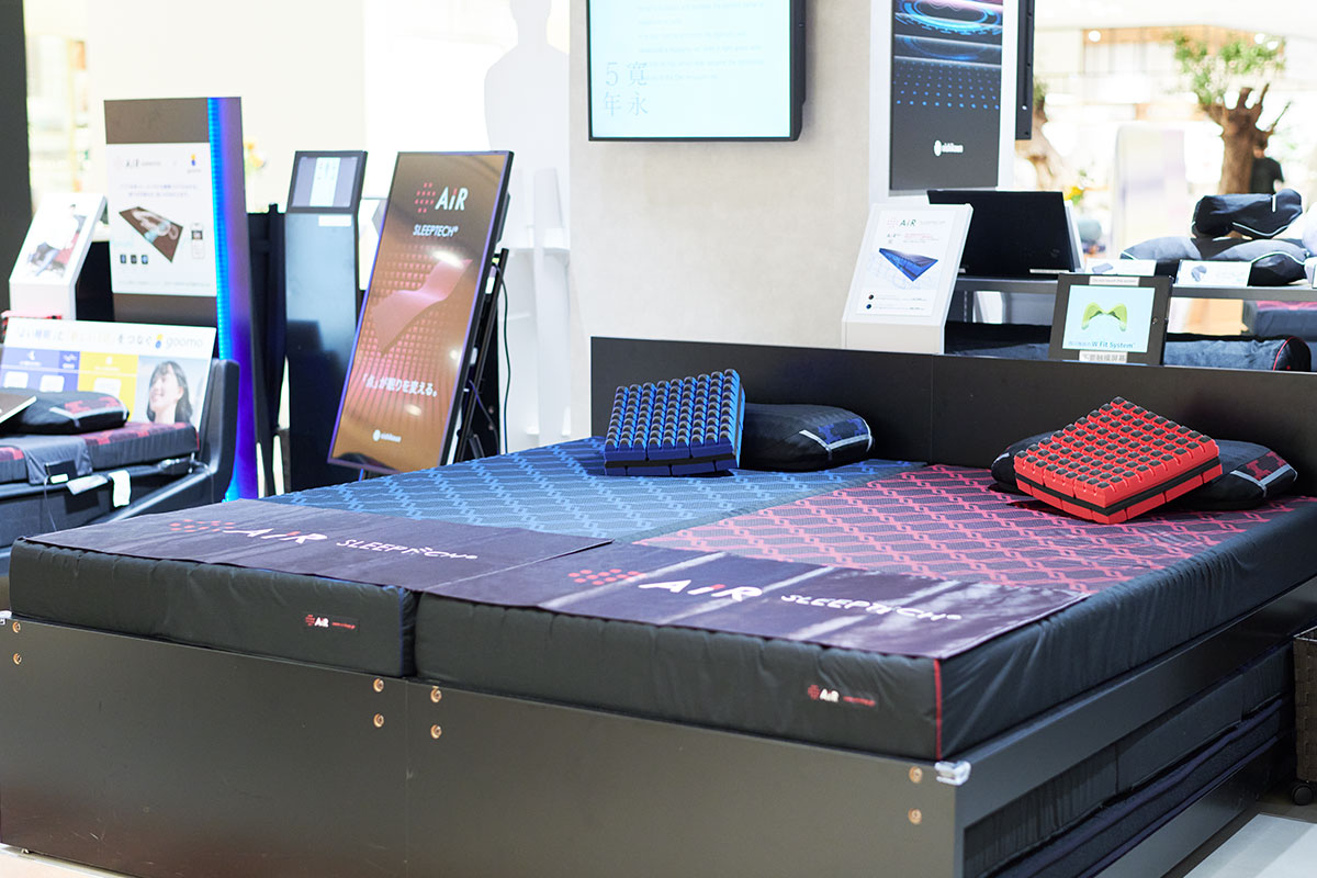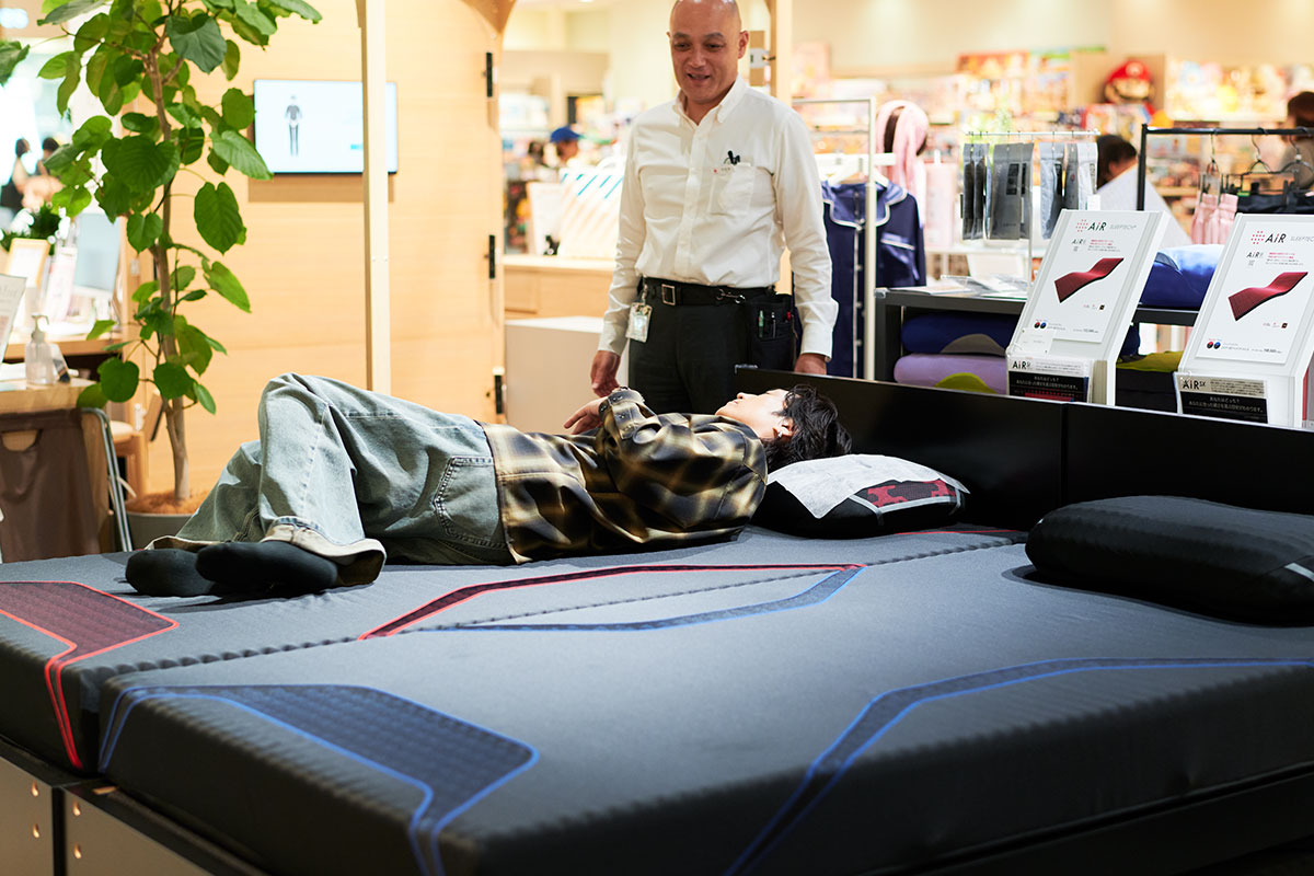 「一度来てくださったのですね。ありがとうございます。こちらは、マットレスのAiRシリーズとオーダーまくらは全商品を取りそろえていて、すべて体感していただけます。睡眠のエンターテインメントパークとして、お客様が最新デジタル機器や測定器を体験し、商品体感することで驚いたり発見をしたりして、楽しみながら自分に合ったマットレスやまくらなどを見つけて、質の高い睡眠をつかみとってほしいと願っております」