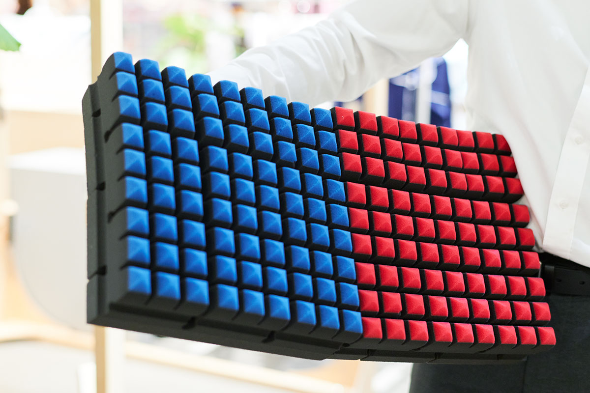 9種類の素材を触って回った落合さんは、「やわらかすぎるよりは、少し硬さのあるほうがいいですね」