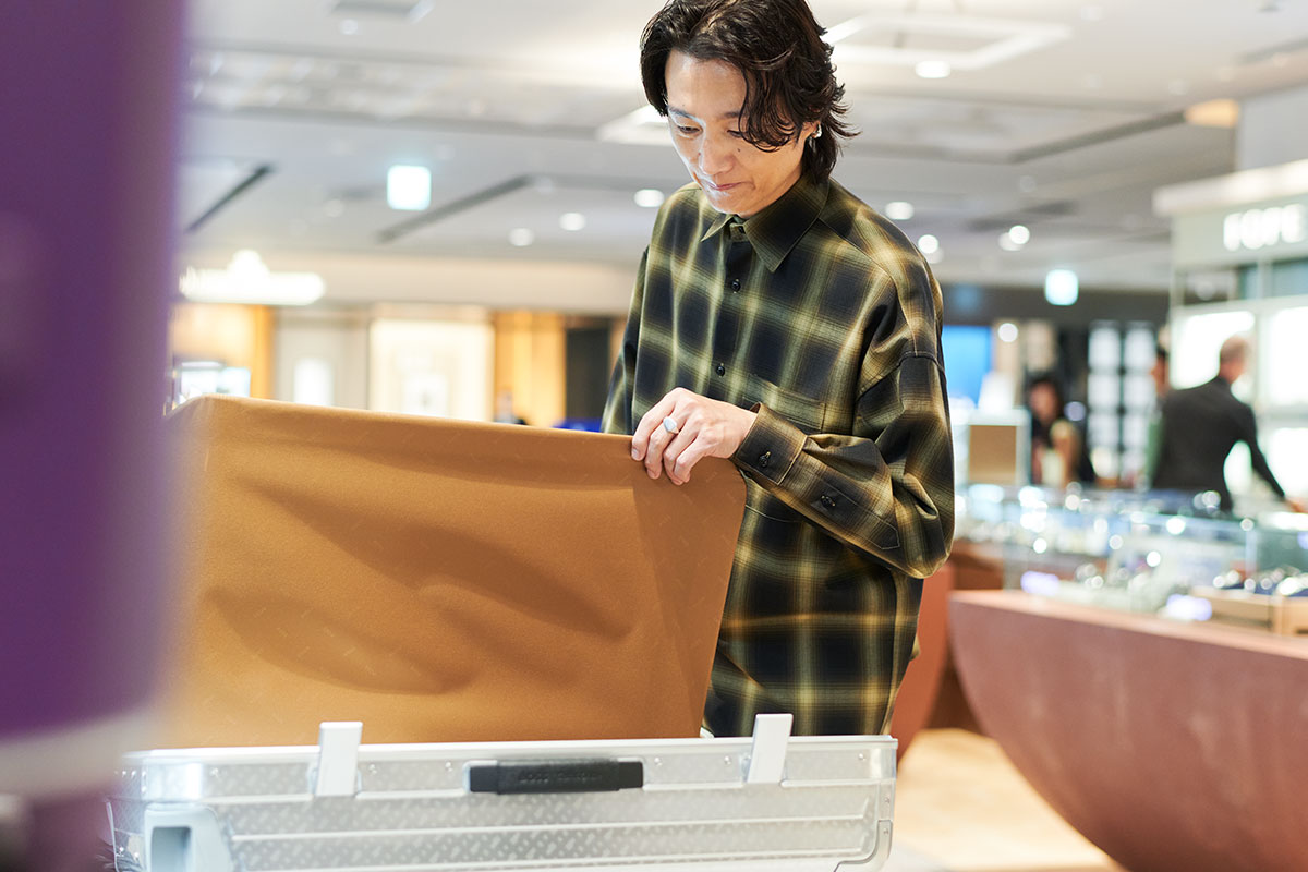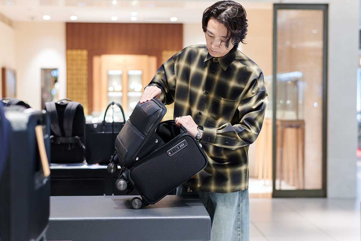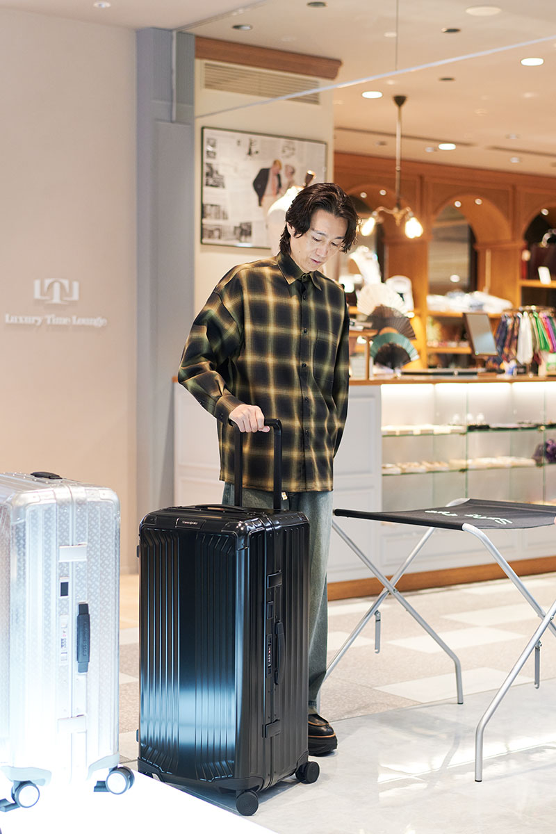 国内で1泊2日の移動などが多いという落合さん。「サムソナイト・ブラックレーベル」では、小さめのケースでもサスペンションとベアリングボールがホイールに内蔵されているものがほとんどということを聞き、「それはいいですね。やはり、スーツケースはスムーズに動いてくれないと旅のストレスになりますから。とても大事なことですね」