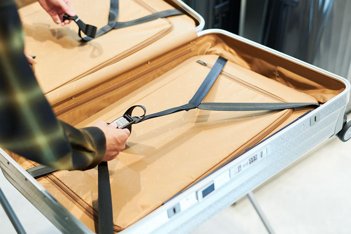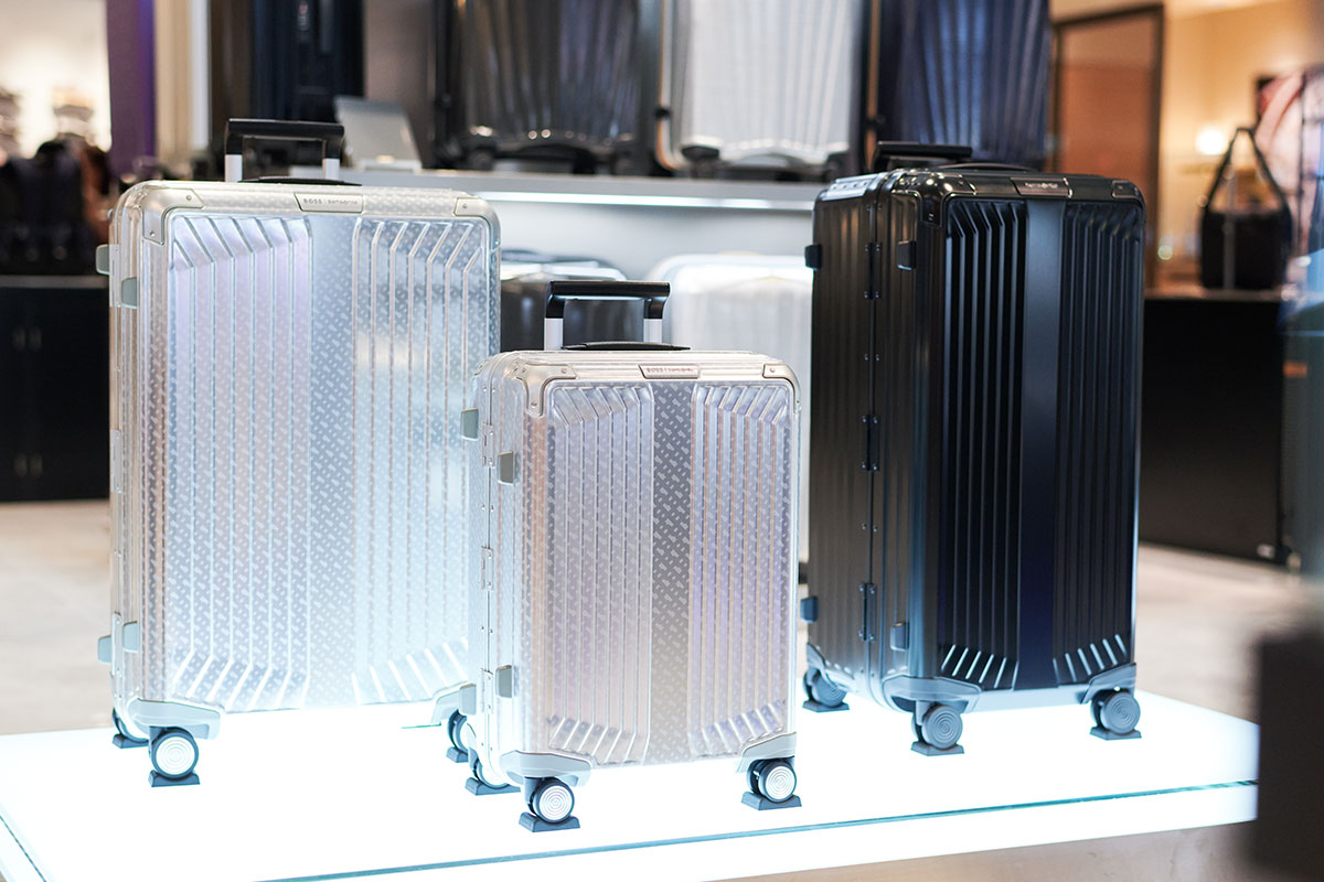 大丸心斎橋店の「サムソナイト・ブラックレーベル」では限定品も取りそろえています。まずは、ドイツ発祥のファッションブランド「BOSS」とコラボレートしたスーツケース、スピナー76を紹介します。
