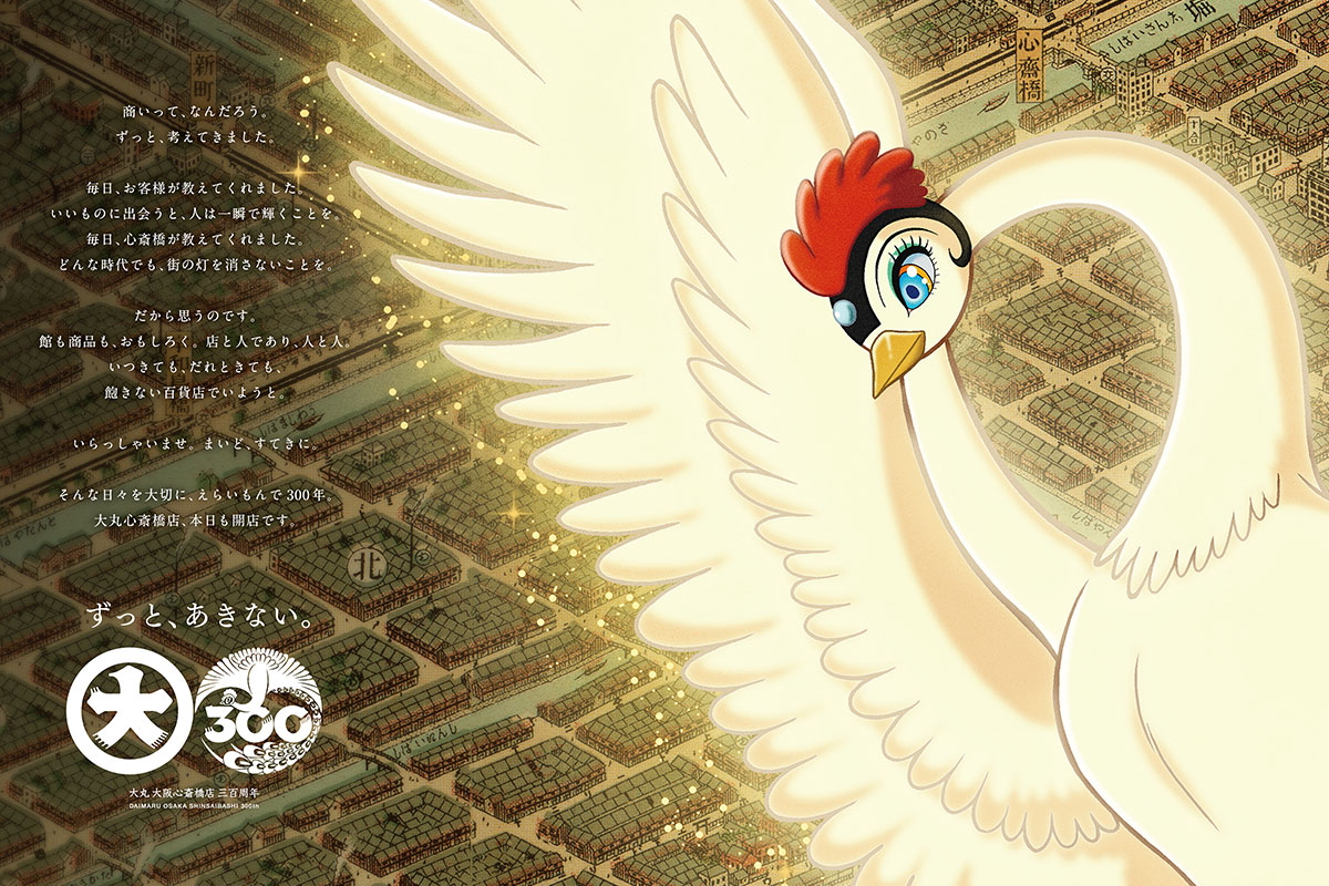 手塚治虫さんが描き続けた未来へのメッセージは、彼が遺した1つ1つの作品の中に生き続けています。そして300年という歴史を通して、大丸心斎橋店も商いの火を灯し続けています。この先に広がる未来へ向けたずっと変わらない想いと新たな決意。優雅に羽を広げて輝く火の鳥が、そんな未来を静かに見守っているようです。