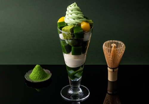 茶寮都路里を代表する人気パフェは、珠玉の甘味を一堂に集めた究極の逸品。抹茶・バニラアイスクリームに、白玉、抹茶ゼリー、小豆などを重ね、多彩な風味と食感を一口ごとにお楽しみいただけます。