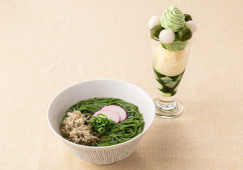 茶寮都路里特選の温かい抹茶そばとパフェのセットです。 「白玉パフェ」「宇治パフェ」「ほうじ茶パフェ」からお選びいただけます。