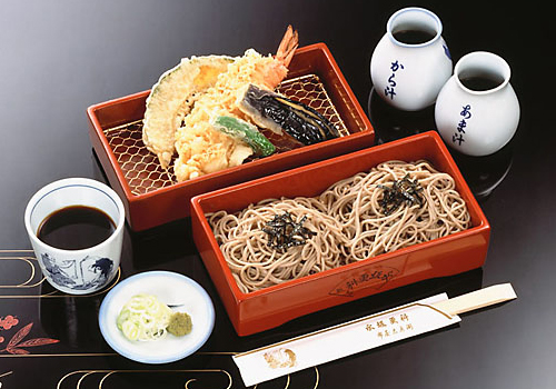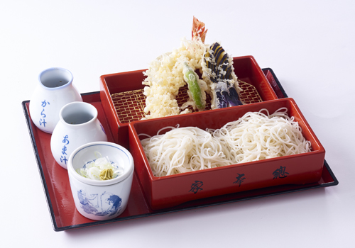 カラッと揚げた海老と野菜の天ぷらを御膳そばと太兵衛そばの合盛りでお楽しみ下さい。