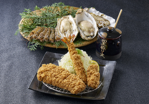 まい泉自慢の黒豚とんかつと、広島県産のジューシーなカキフライと車海老フライを盛り合わせましたお膳です。とんかつはヒレ又はロースよりお選びいただけます。
