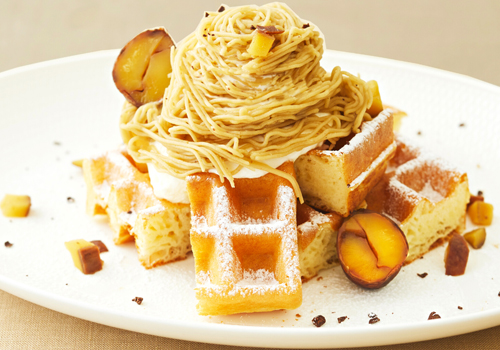 焼きたてのワッフルに なめらかな口あたりの渋皮栗と風味豊かなマロンクリームを秋らしく盛り付けました。バニラアイスとご一緒にお楽しみください。