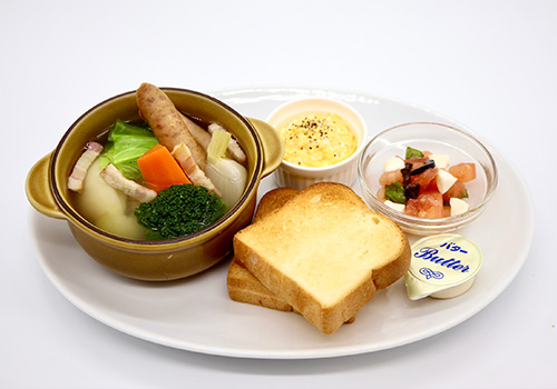 旬の野菜とソーセージ、ベーコンをじっくりと煮込み、ごろっと具沢山のポトフに仕立てました。野菜本来の甘味と旨味が溶け込んだスープは寒い日にぴったりの味わいです。二種の小鉢とミニ食パンと共にお召し上がりください。※1月8日(木)からのご提供となります。