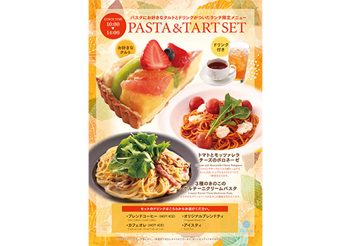 パスタで満たされて、タルトで幸せに!一度に楽しめるドリンク付きのご褒美ランチです。※ランチ限定メニュー 10:00~14:00までのご提供となります。